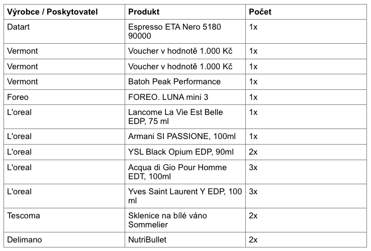 3.1 Seznam hodnotných výher, které budou rozdány vybraným soutěžícím je uveden níže.